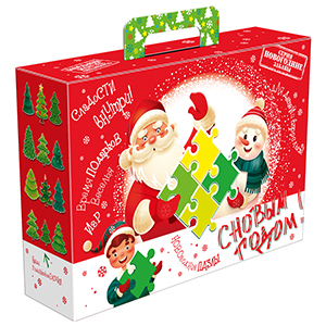 Новогодний чемоданчик в красно-белом оформлении. На упаковке задачи на логику и внимание. Внутри коробки: пазлы с новогодним сюжетом, 63 детали.