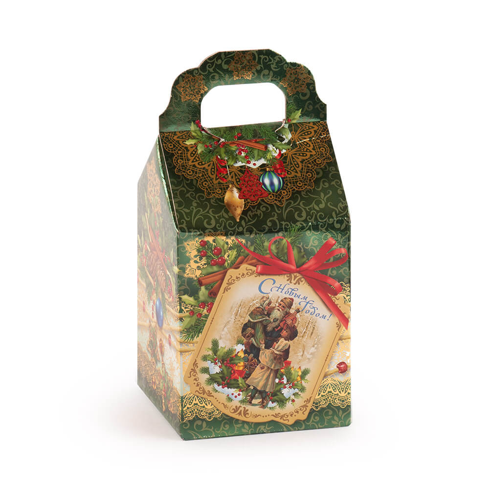 Прекрасный новогодний подарок — сладкий набор в картонной коробке в винтажном стиле. Упаковка с ручками в виде домика украшена елочными игрушками и витиеватыми узорами, на старинной открытке с красным бантиком Дед Мороз дарит детишкам подарки.