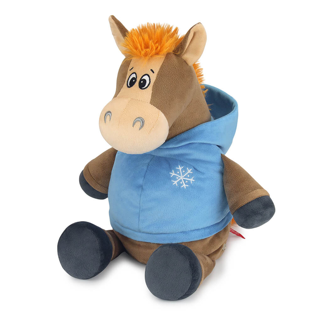 Мягкая игрушка Лошадь Орион сшита из мягкого софта коричневого цвета. У лошади голубая жилетка с белой снежинкой. Внутри мягкой игрушки потайной карман на молнии со сладким подарком. Набор конфет 600г Премиум.