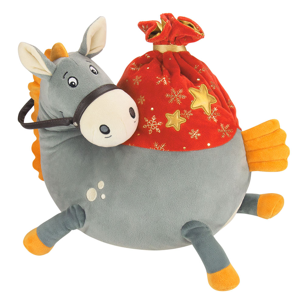 Новогодний подарок конь Меркурий сшит из мягкого софта серого цвета. У него грива золотистого цвета, сверху мешочек ярко-красного цвета с золотыми звездами. Внутри мягкой игрушки потайной карман со сладким подарком, который затягивается шнурком. Набор конфет 1000г Люкс.