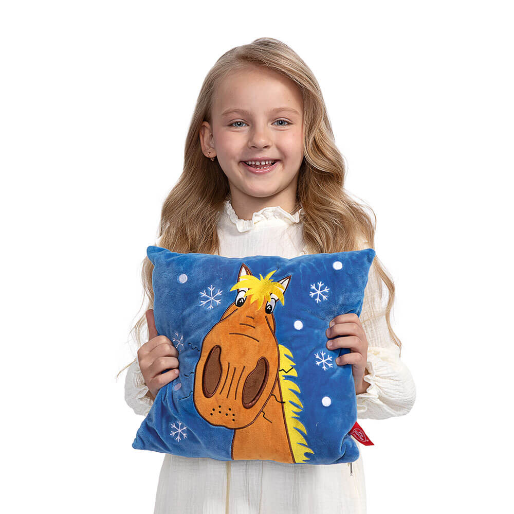 В синих оттенках мягкая подушка из короткого меха и софта с аппликацией Лошади Расмус в коричневых и желтых оттенках. У Расмуса ярко-жёлтая грива. Внутри подушки потайной карман на молнии со сладким подарком. Набор конфет 800г Премиум.