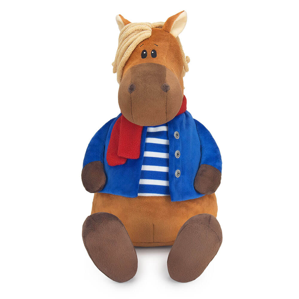 Подарок 2026 конь Билли сшит из мягкого софта коричневого цвета. У него полосатая футболка с синей рубашкой, также красный шарф, который элегантно перевязан. Внутри мягкой игрушки потайной карман на молнии со сладким подарком. Набор конфет 600г Люкс