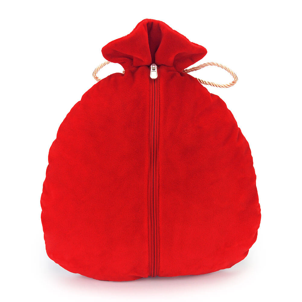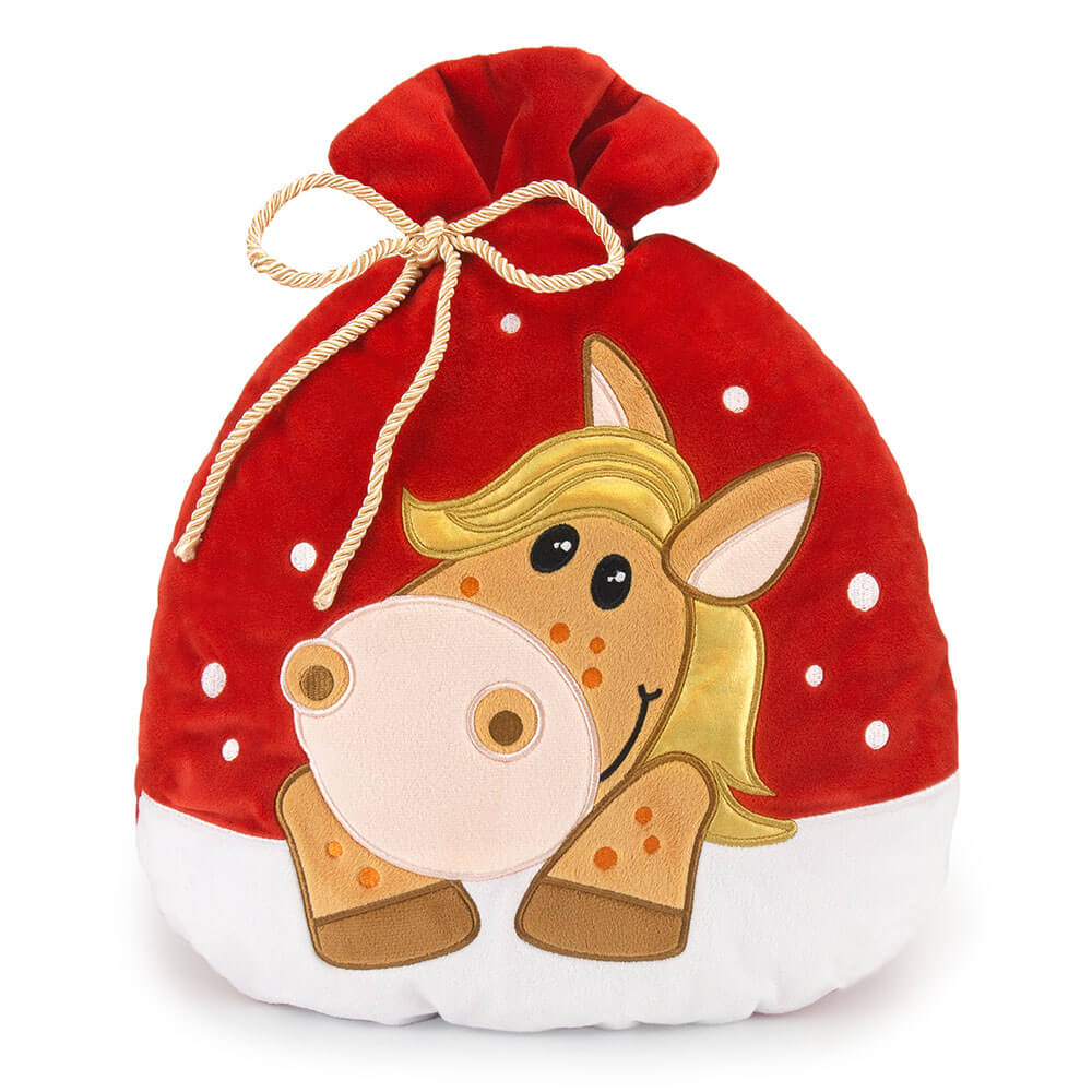 В красных оттенках мягкая подушка из короткого меха и софта с аппликацией Лошади Руби в сливочных оттенках. Подушка выглядит как мешочек. Внутри подушки потайной карман со сладким подарком. Карман затягивается золотым витым шнуром. Набор конфет 800г Люкс.