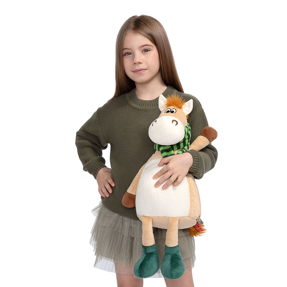 Мягкая игрушка Лошадь Пик сшита из мягкого софта бежевого цвета. На шее у лошади зелёный в полоску шарф, который элегантно перевязан. Внутри мягкой игрушки потайной карман на молнии со сладким подарком. Набор конфет 800г Премиум.