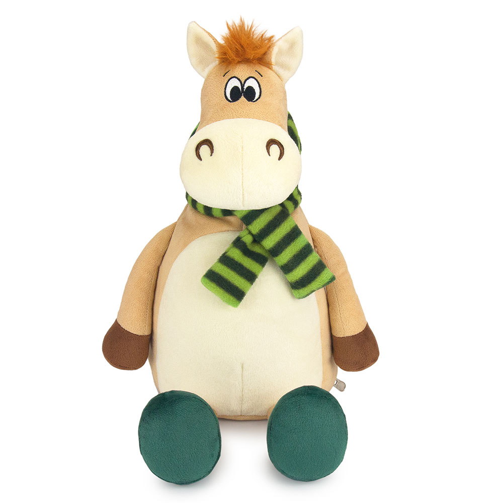 Мягкая игрушка Лошадь Пик сшита из мягкого софта бежевого цвета. На шее у лошади зелёный в полоску шарф, который элегантно перевязан. Внутри мягкой игрушки потайной карман на молнии со сладким подарком. Набор конфет 800г Стандарт.