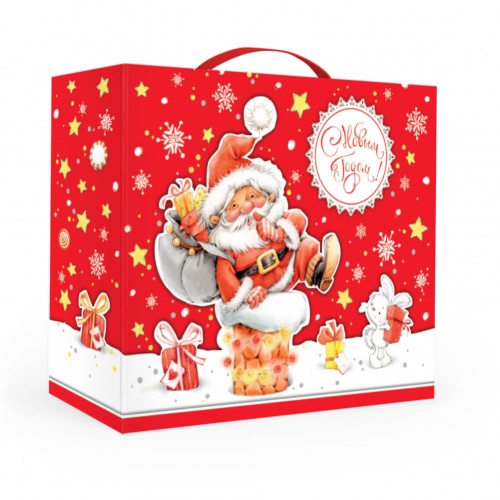 Подарочный короб из картона с пластиковой ручкой с изображением Деда Мороза с мешком подарков.