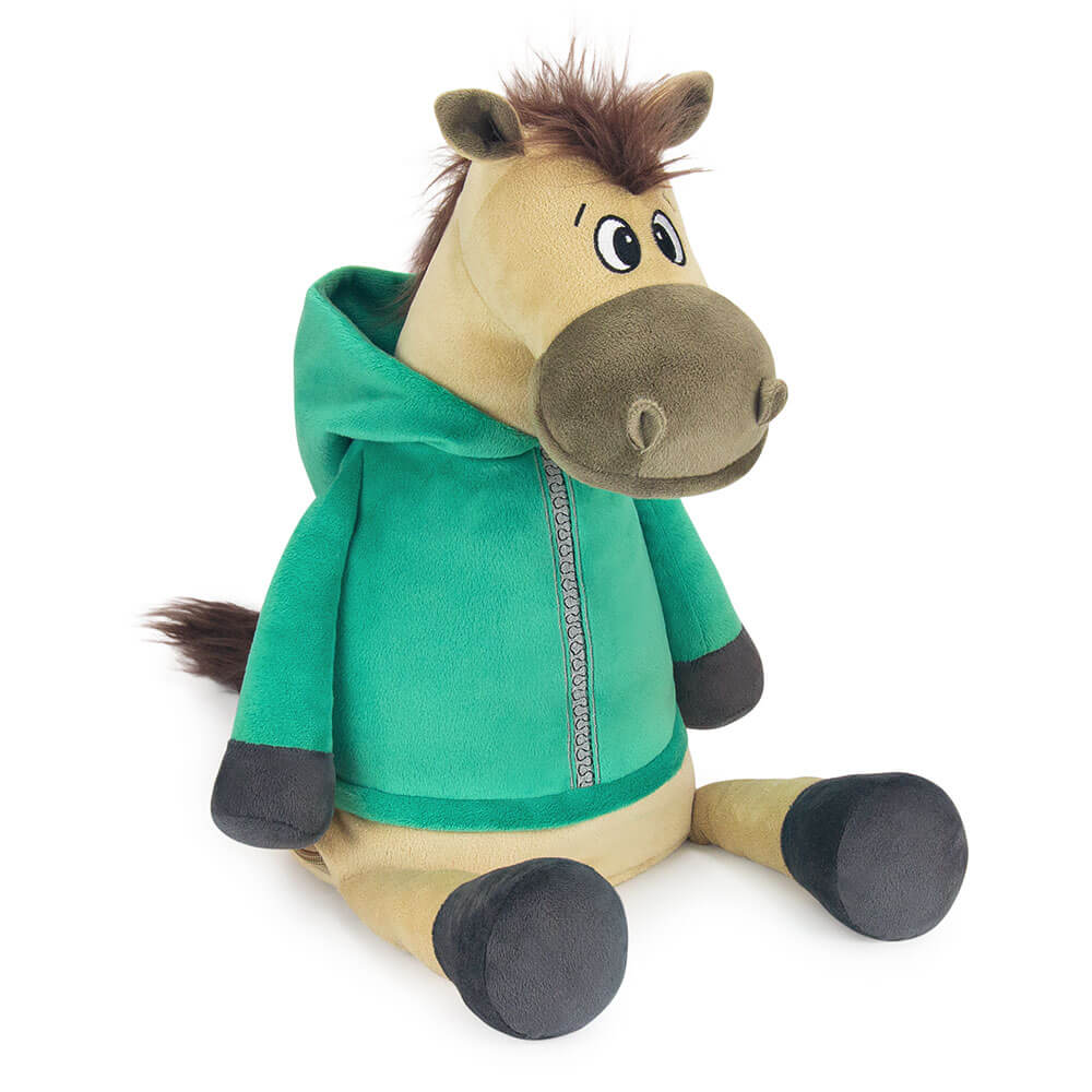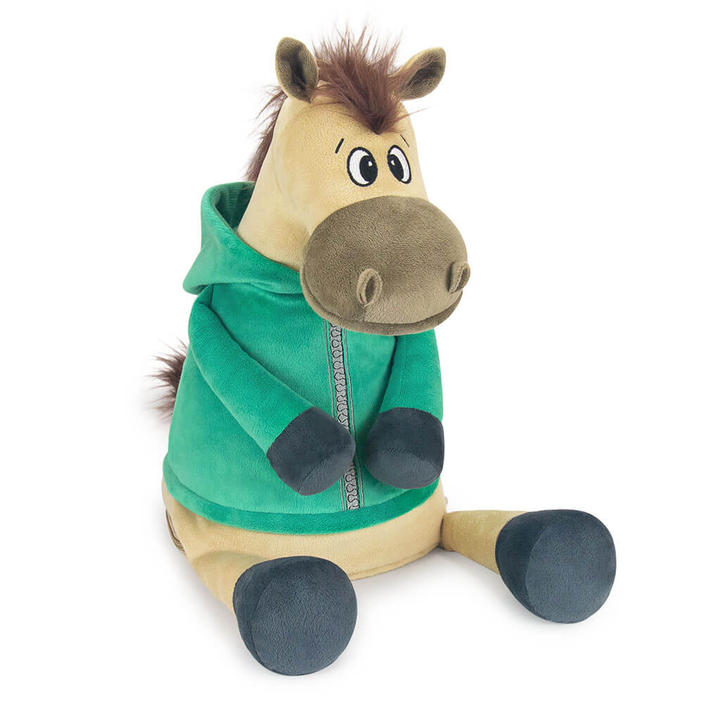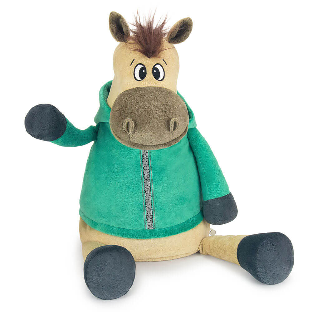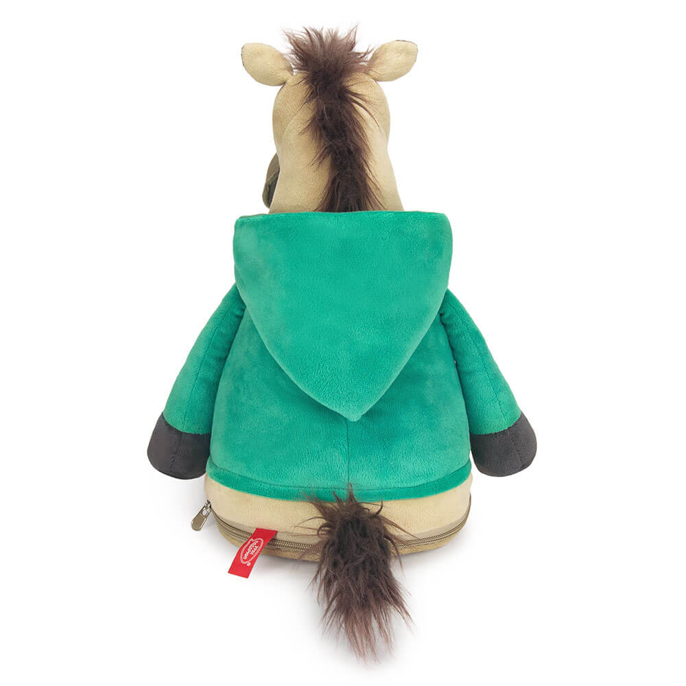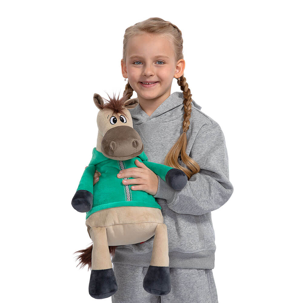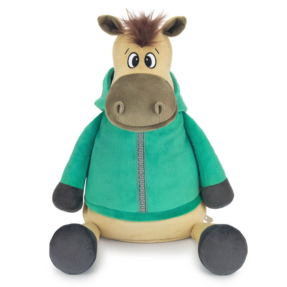 Оригинальная новогодняя текстильная упаковка для сладостей вместимостью до 1300 г. Мягкая игрушка с карманом на молнии для конфет лошадь Малахит.