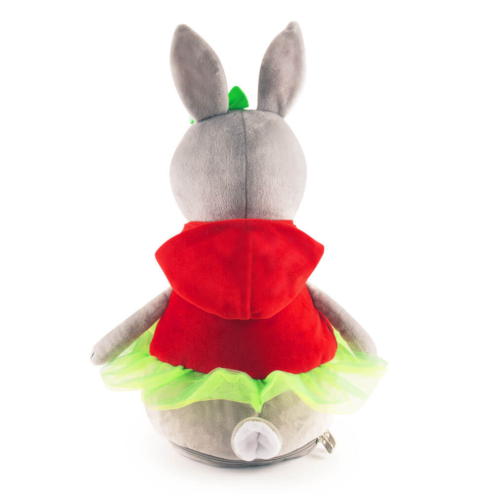 Текстильная упаковка игрушка зайка Оливия в красной толстовке с юбочкой.
